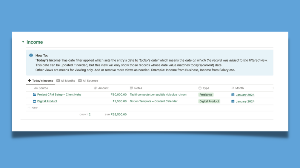- Income Management Made Easy: Keep tabs on your various income streams effortlessly. Whether it's your salary, freelance gigs, or side hustle, Notion Finance Tracker has got you covered.